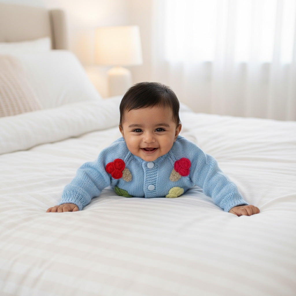 Soft as a cloud and full of little delights, the Scoops of Joy Hand-Knitted Cardigan is designed to keep your mini cozy while adding a playful pop of color. Hand-knitted in a calming sky-blue hue, it features adorable 3D ice-cream–inspired motifs that make every wear extra special. Lightweight, breathable, and gentle on baby skin, this cardigan is perfect for everyday comfort and cheerful outings alike.